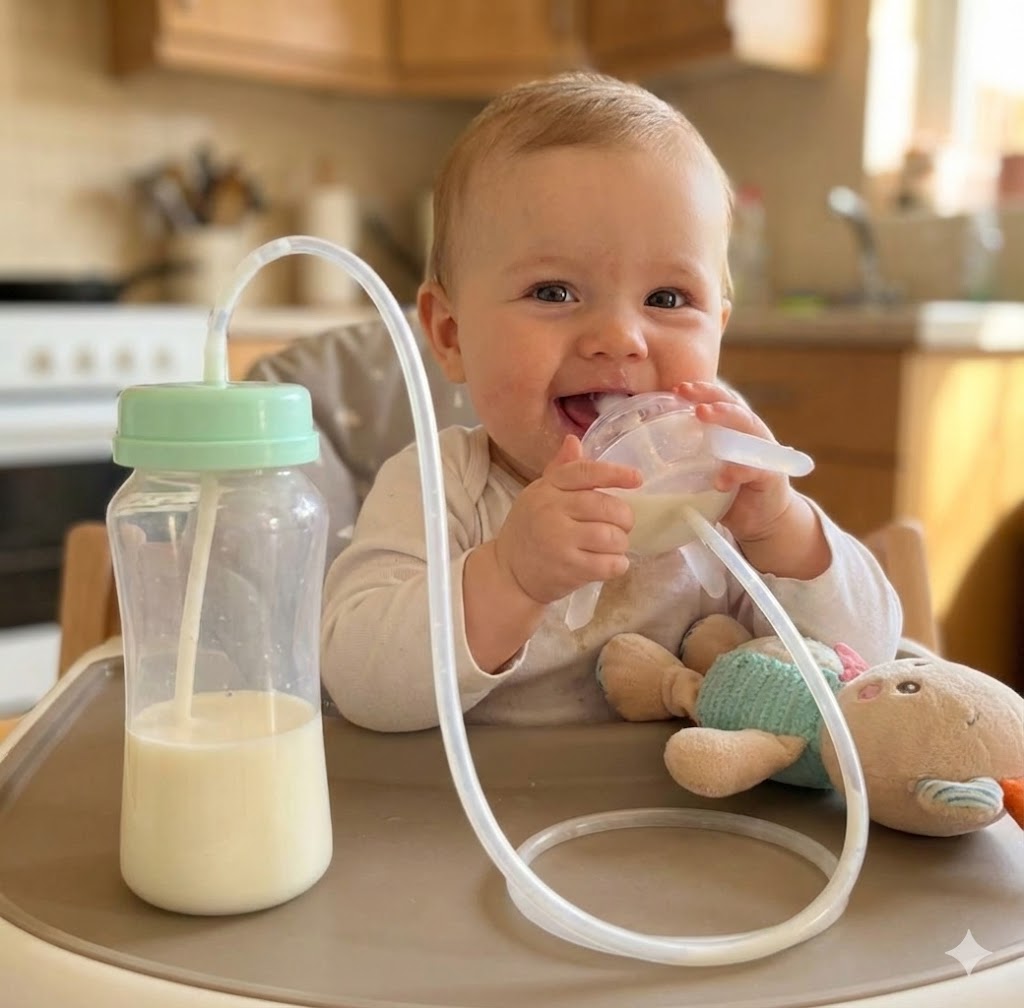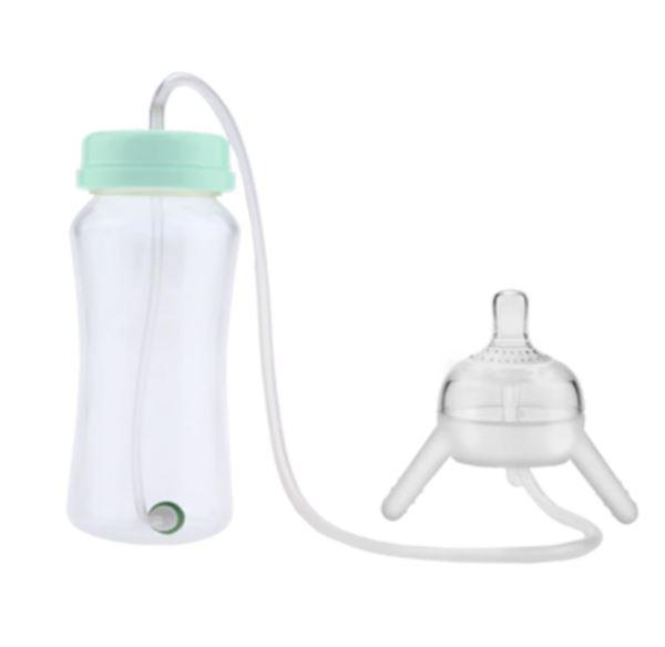 4. Aanhappen: Help je baby de speen te pakken. Zodra ze zuigen, stroomt de melk door het slangetje.