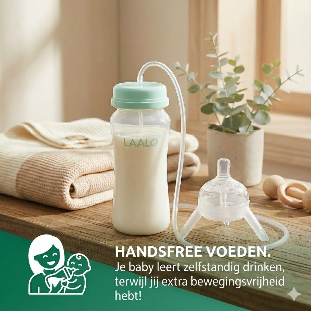 Maak kennis met de ultieme hulp voor drukke ouders. Met de LAALO Handsfree Babyfles™ drinkt je kleintje op een natuurlijke, rustige manier, terwijl jij je handen vrij hebt om even te ontspannen, een boek te lezen of je andere kindje aandacht te geven.